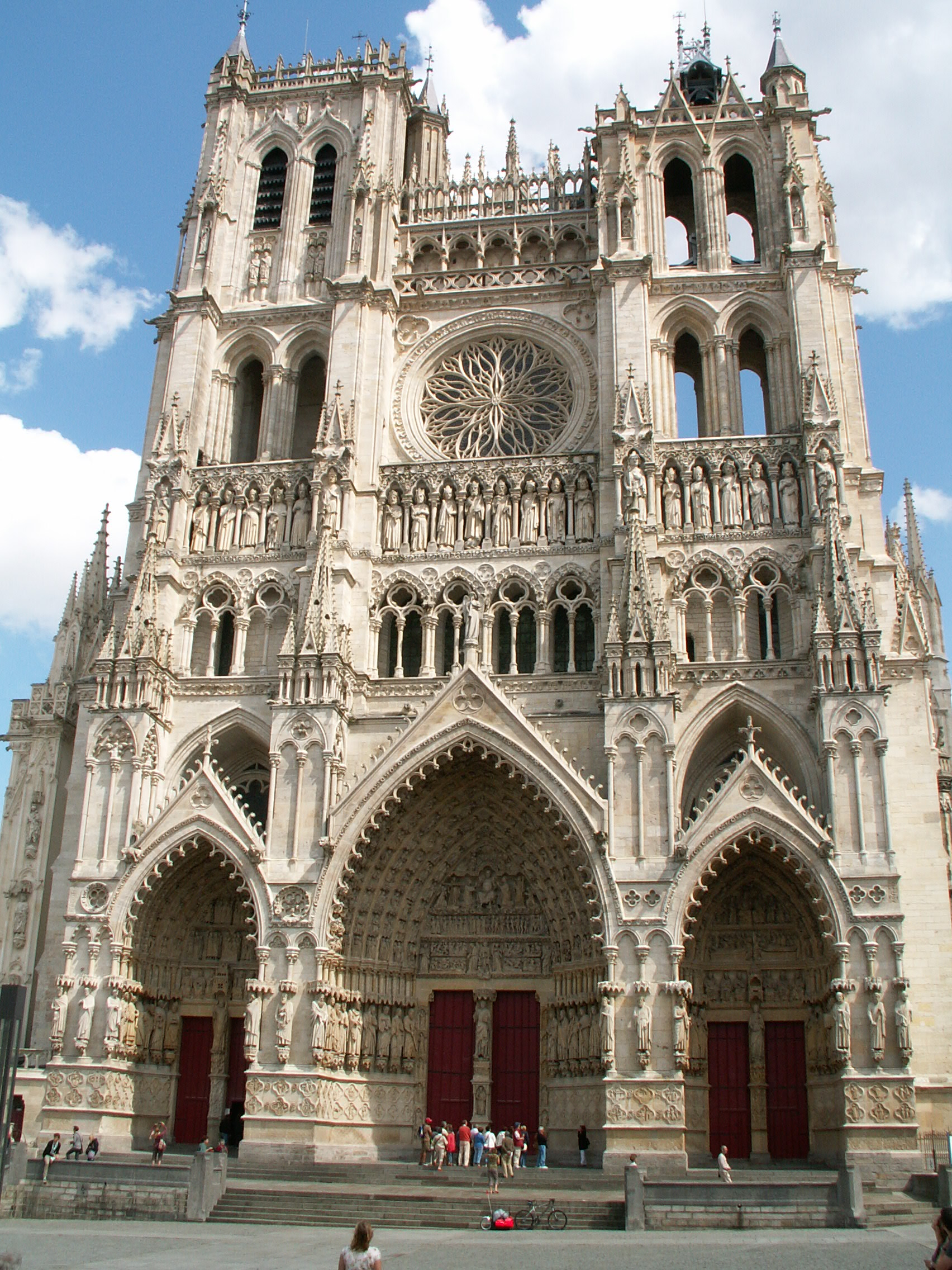 Notre-Dame d’Amiens fut commencée en 1220 par l’évêque Evrard de Fouilloy, sous la direction du maître-maçon Robert de Luzarches, puis de Thomas et Renaud de Cormont. La nef était terminée vers 1233, le choeur en 1269, les tours après 1336 (sud) et en 1402 (nord).