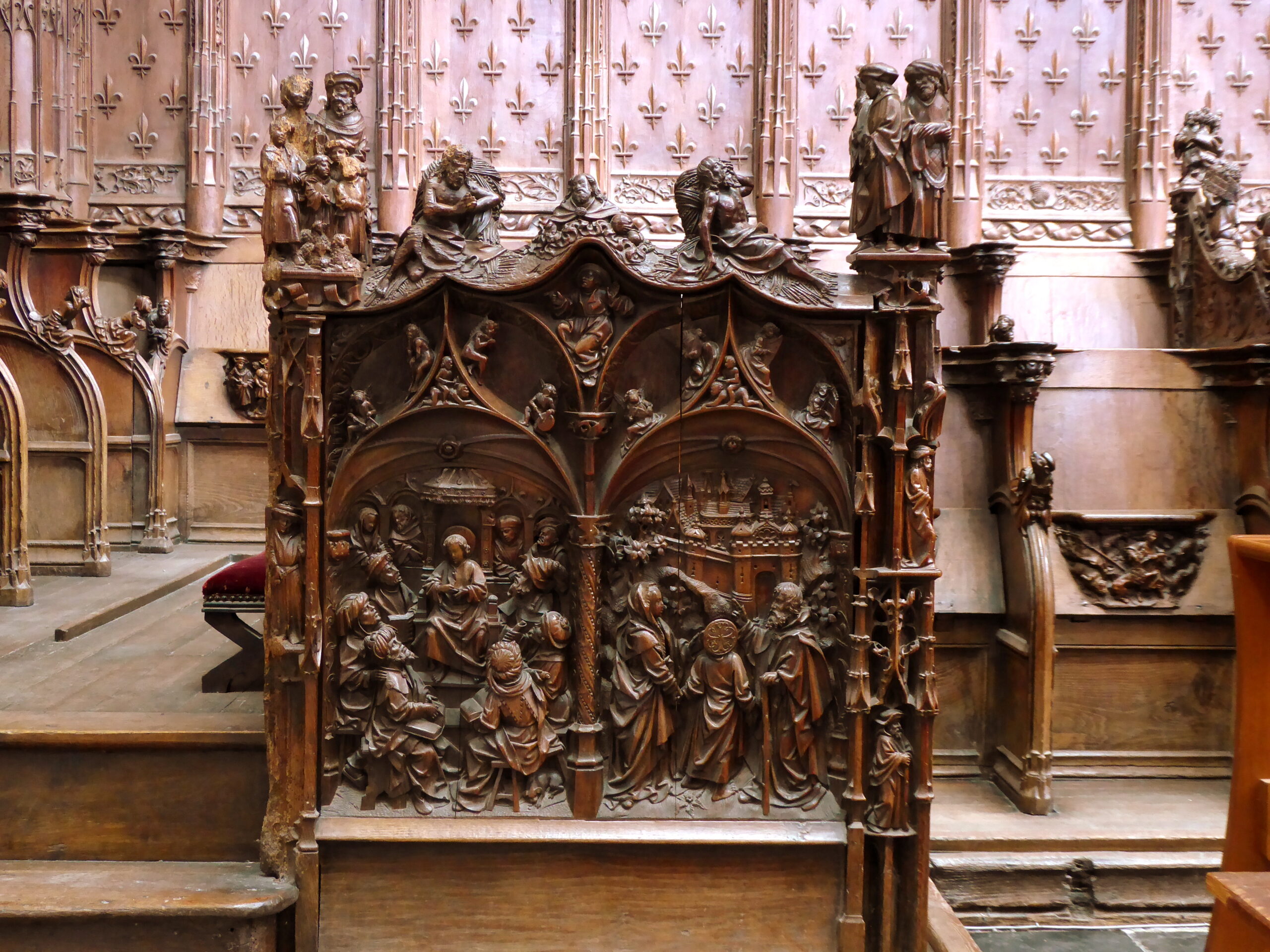 Noter : beaux vitraux dans le choeur et les trois grandes roses (flamboyante à l’ouest), tableaux, autels, grilles, somptueuses stalles du XVIe siècle, magnifique clôture du choeur (1490), chapelles rayonnantes, chapelles latérales (XIVe s.) de la nef. La flèche, refaite après l’incendie de 1528 (113 m), est la seule ancienne conservée en France.