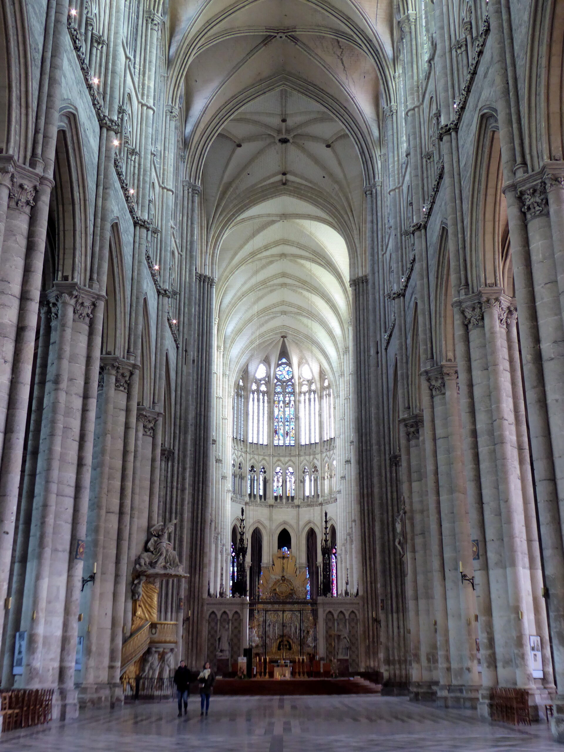 L’une des plus vastes et complètes cathédrales de Franc (7 700 m2, 145 m de long h.-o., larg. : 14,60 m, haut. : 42,30 m de , long. du transept :70 m), possède en façades ouest et du bras sud d’immenses portails richement sculptés, constituant ensembles théologique, iconographique, moral et naturel parmi les plus complets. Le choeur très lumineux est l’aboutissement du modèle de la nef, classique au 1er nbiveau, rayonnant aux étages et très hardi.