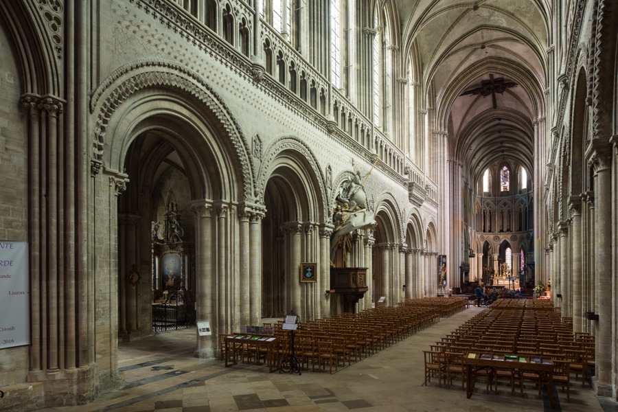 Notre-Dame de Bayeux (long. : d.-o. : 96 m) fut rebâtie par ses évêques après 1160, le choeur entre 1220 et 1269, l’étage supérieur de la nef vers 1250 (haut. : 24 m), en style normand, les bras du transept (long. : 37 m), avec riche portail sculpté au sud, jusque vers 1300 et dans le style « rayonnant parisien», comme les chapelles ajoutées à la nef (fin XIIIe et XIVe s.), les deux flèches ouest étant du XIIIe s.. La tour flamboyante de croisée (80 m), due à l’évêque Louis d’Harcourt en 1477-79, couverte d’un dôme en 1713-14, fut sauvée par une audacieuse reprise en sous-oeuvre et restaurée en 1857-58.