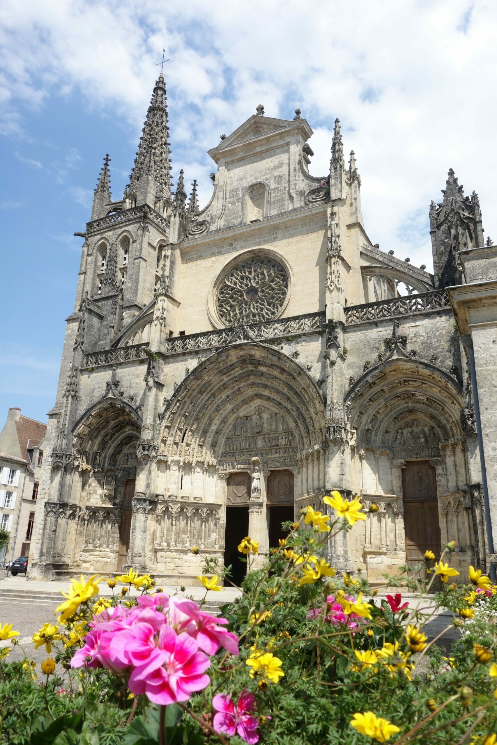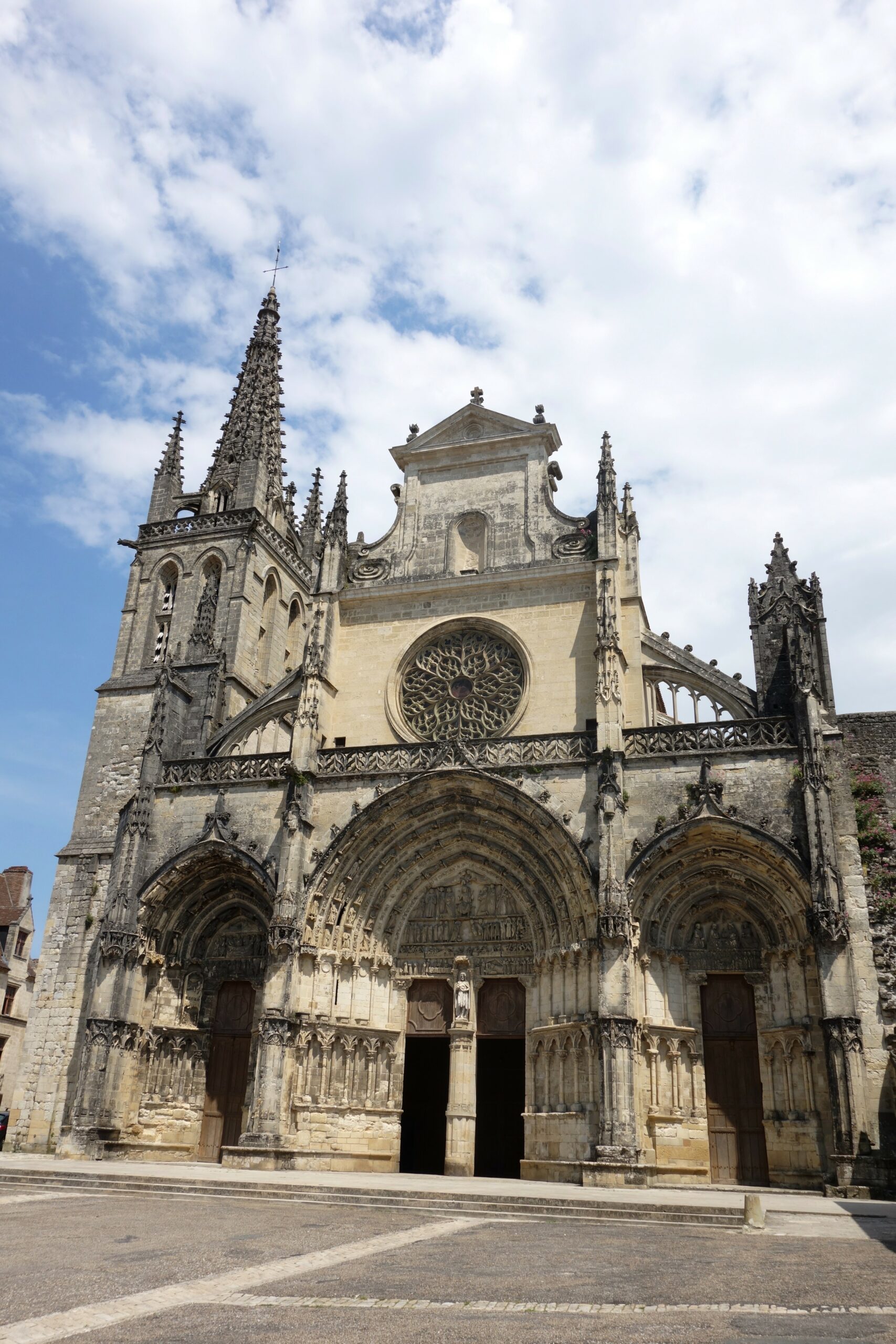 La façade, au pignon de style classique (1725), comporte trois grands portails sculptés de la seconde moitié du XIIIe s. (Jugement dernier au centre, Dormition et Couronnement de la Vierge au sud, saint Pierre au nord) et une belle rose flamboyante.
