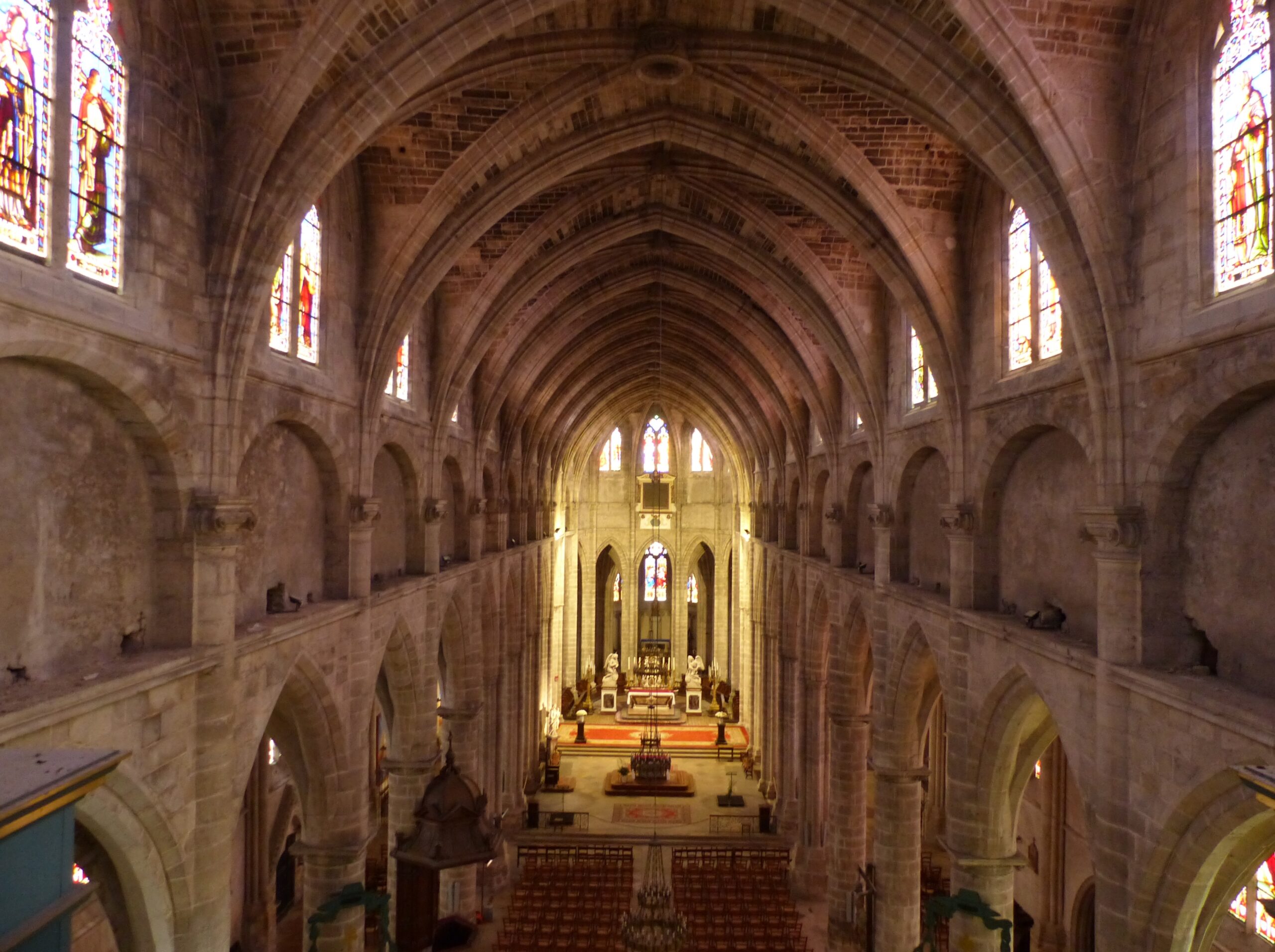 La tour, au nord de la façade, à longues baies du XVe s. sur socle massif et nu, est couronnée d’une élégante flèche de 48 m, restaurée en 1942-43.