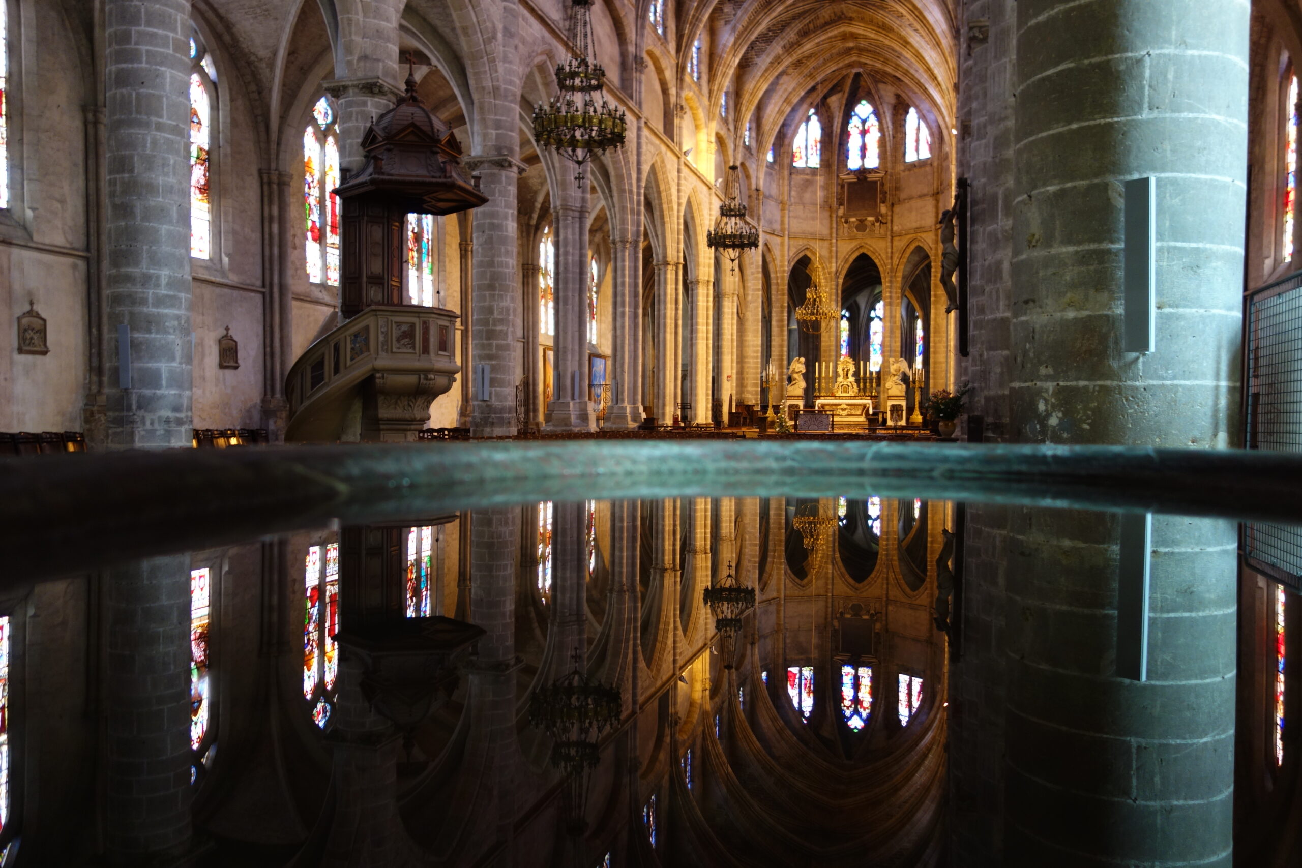Saint-Jean de Bazas, détruite par les Anglais en 1198, avait été rebâtie à partir de 1233. Détruite, hormis la façade et ses portails, par les Réformés, elle fut rétablie de 1583 à 1605 dans son état initial aux frais de l’évêque Arnaud de Pontac, puis jusqu’en 1635. Long de 83 m, large au total de 23 m pour 20,32 m sous clef, le vaisseau sans transept, de style flamboyant, comporte un faux triforium aveugle et une abside à déambulatoire entourée de cinq chapelles rayonnantes.