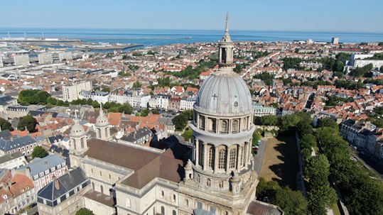 La basilique de style néo-classique de Mgr Benoît-Agathon Haffreingue, qui en réalisa les plans et suivit les travaux de 1827 à 1863, comporte, derrière une façade à quatre niveaux, trois portails (avec porches latéraux) et deux modestes tours, une nef de 6 travées couvertes de coupoles et à collatéraux doubles, un transept peu débordant, un dôme colossal à la croisée (100 m) et une abside arrondie, entourée de cinq chapelles rayonnantes, ornées en 1863-65 de fresques par Charles Soulacroix.