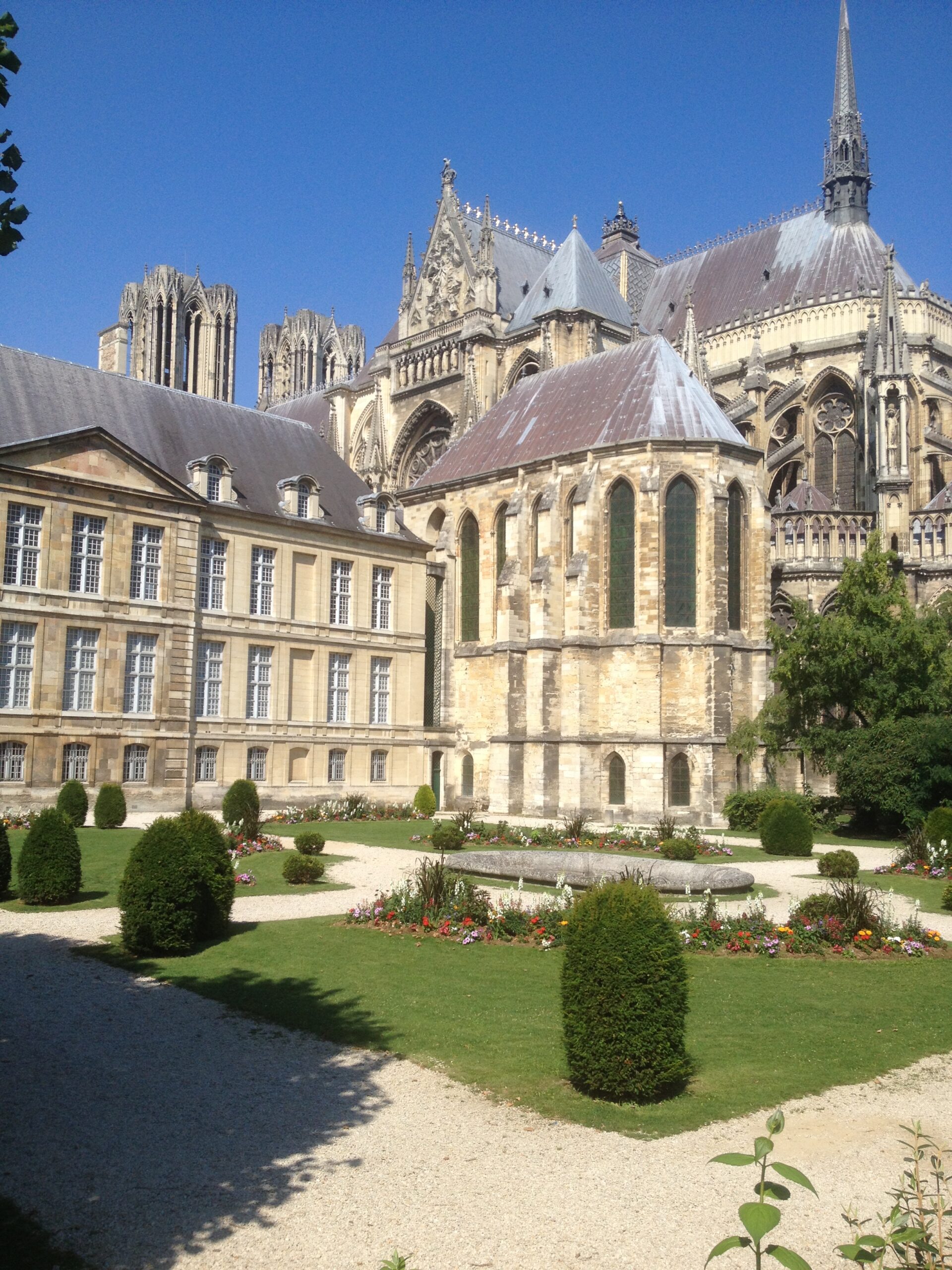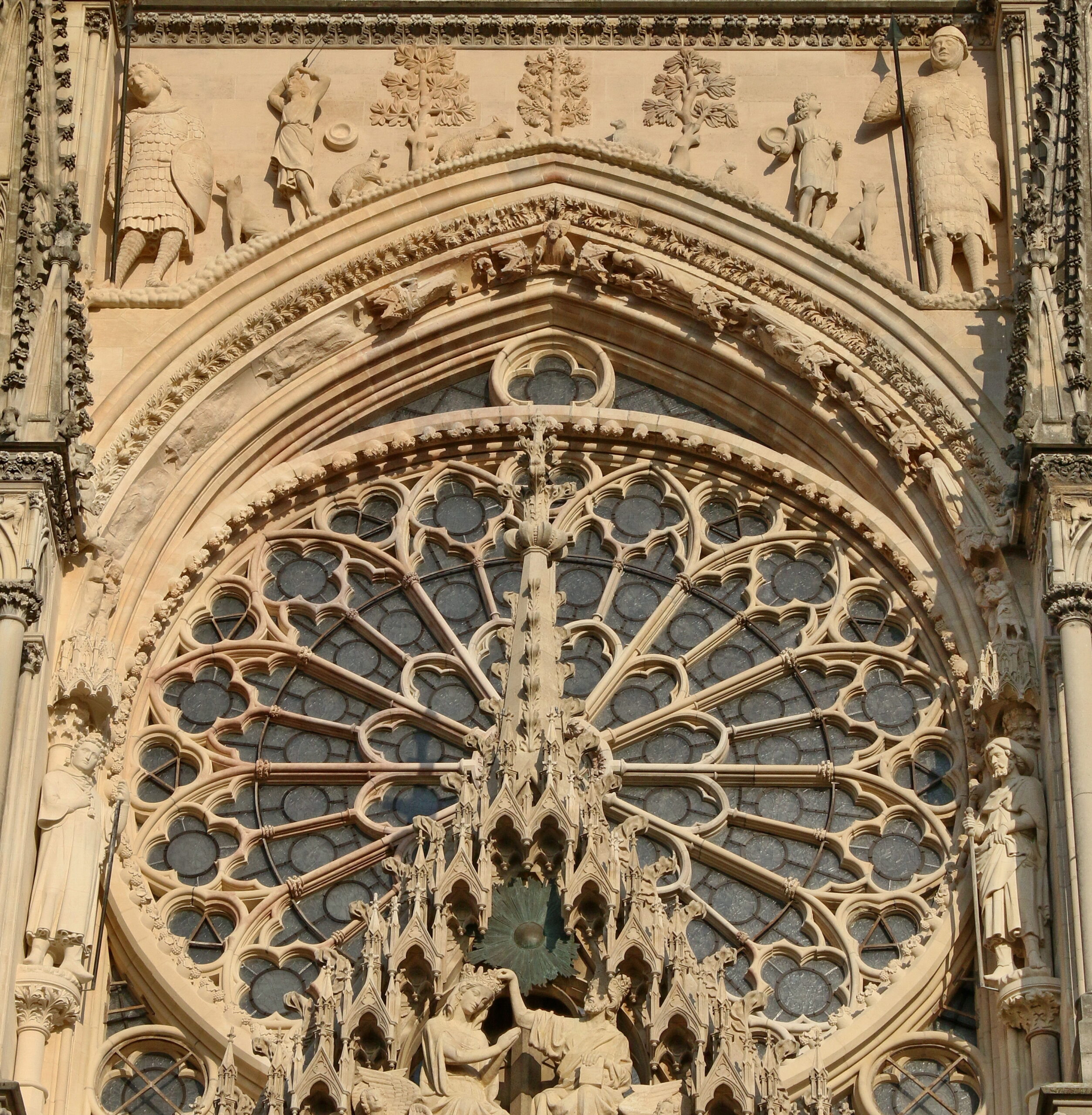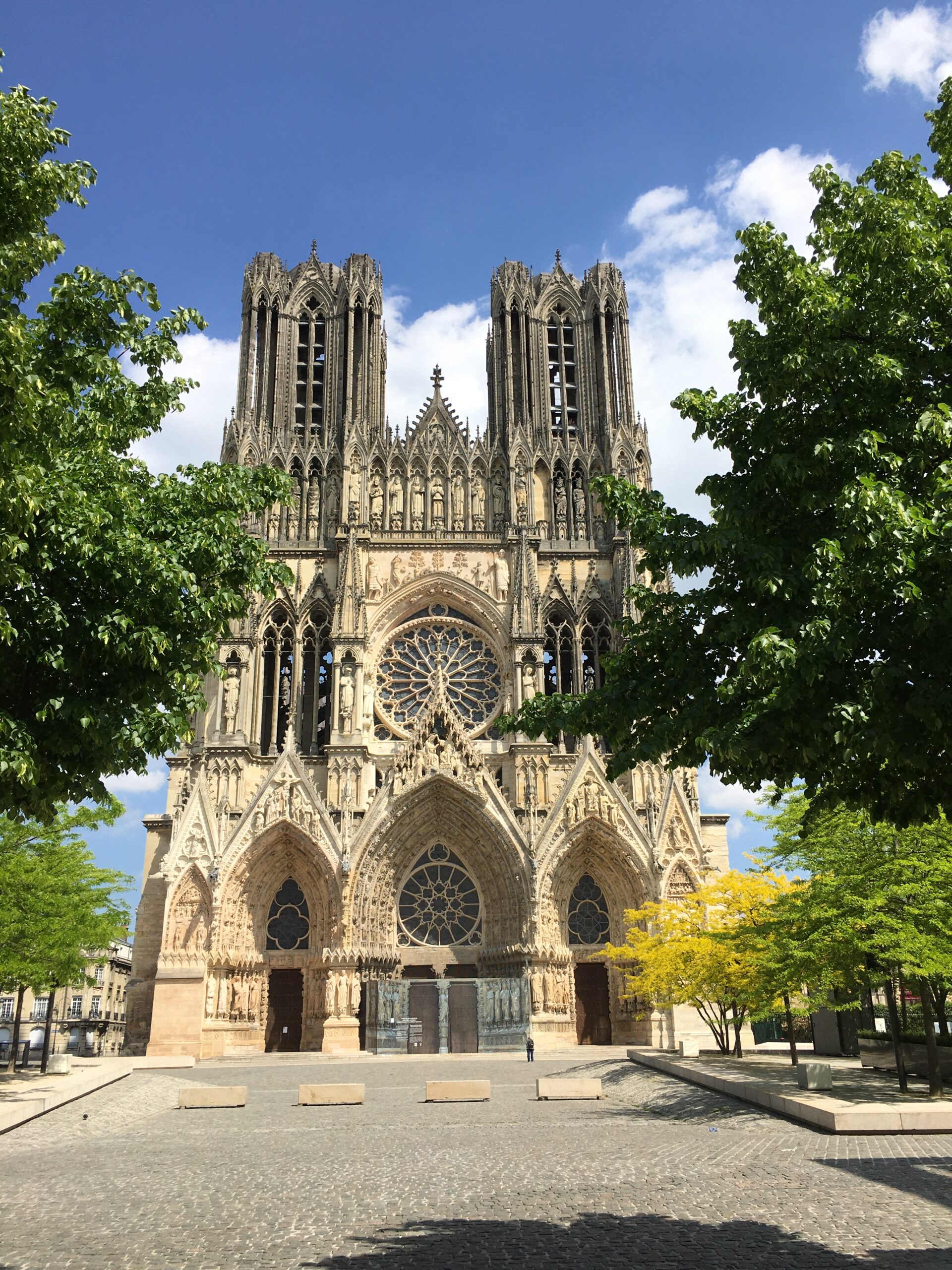 Notre-Dame, église des sacres royaux, entreprise en 1208 (chapelles absidales), est poursuivie par la nef (1er niveau du choeur capitulaire) de 1215 à 1221. La guerre civile de 1233-36 interrompt le chantier du choeur et du transept, terminés en 1241 avec la nef, sauf la façade – chef d’oeuvre du genre – et les trois travées ouest (1252-1296).