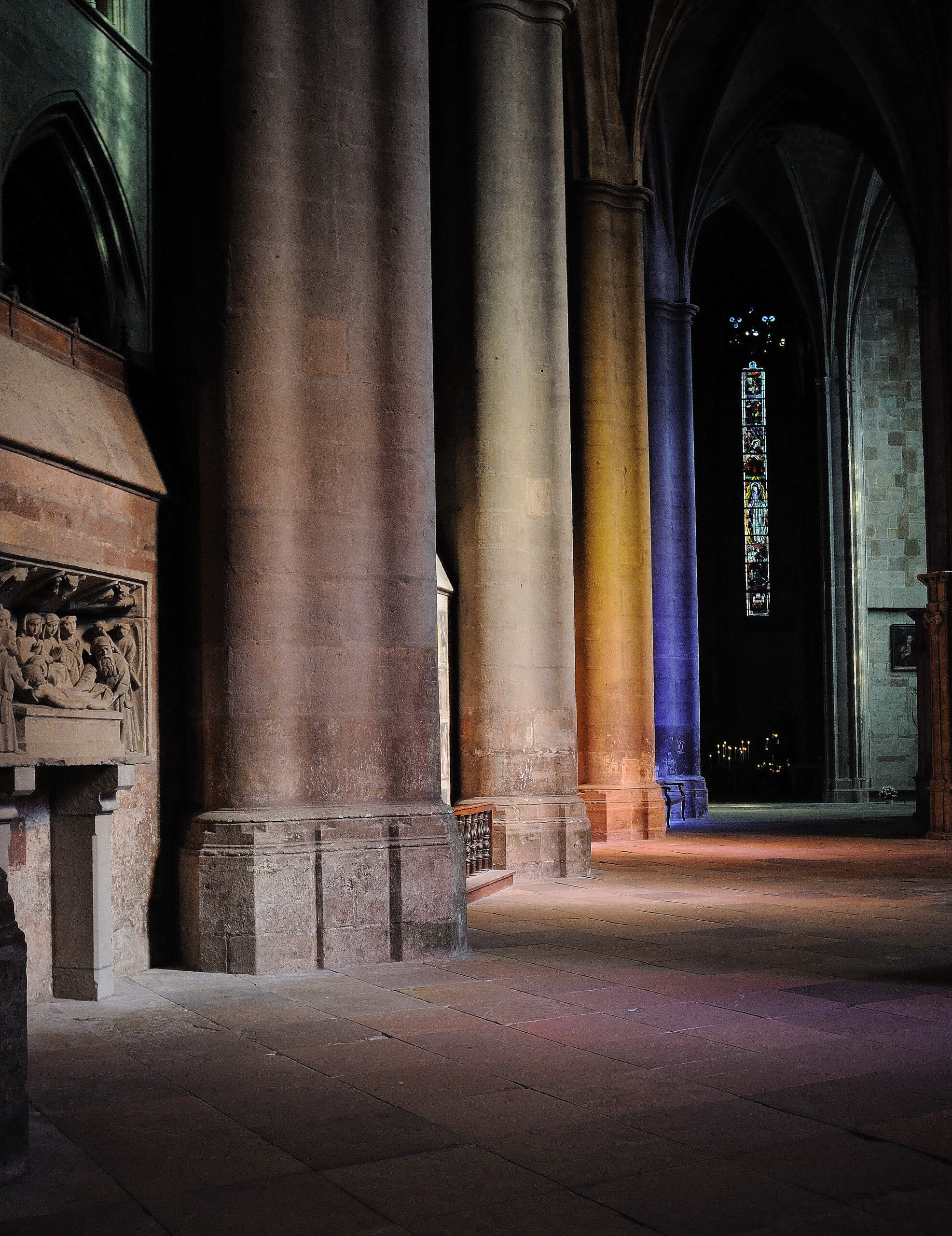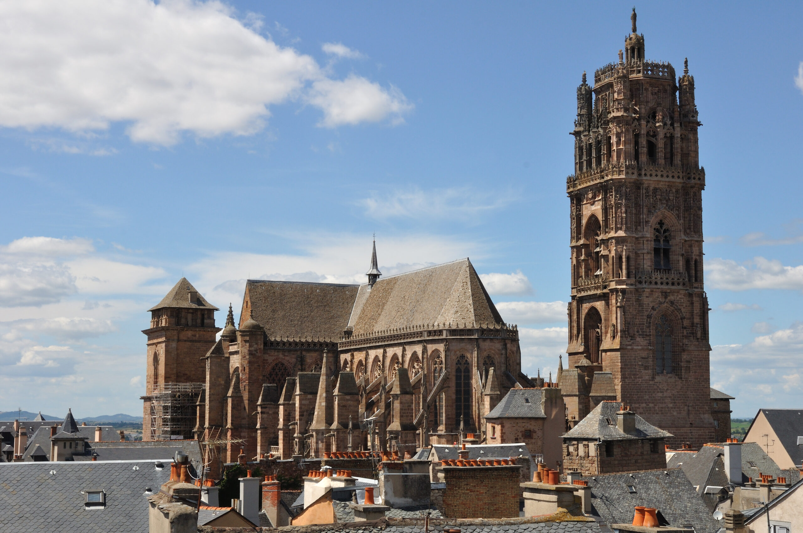 Un haut clocher, entrepris vers 1380 au nord du choeur est augmenté d’un octogone flamboyant (88 m) de 1510 à 1526 par le maître-maçon Antoine Salvanh. L’élévation du vaisseau (30 m) revient à des valeurs du début du XIIIe s. : fenestrage combiné aux surfaces murales, piles cantonnées, triforium aveugle. Jubé de 1468-1478, reporté dans un bras, stalles du XIVe s., restes de clôtures de chœur et de chapelles, retables, tableaux, tombeaux, peintures de voûtes et tables d’autels.