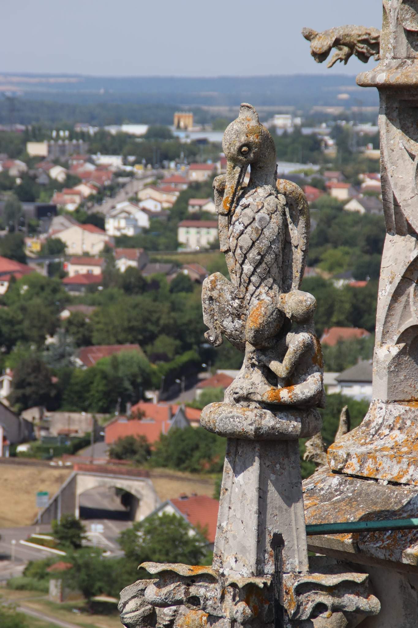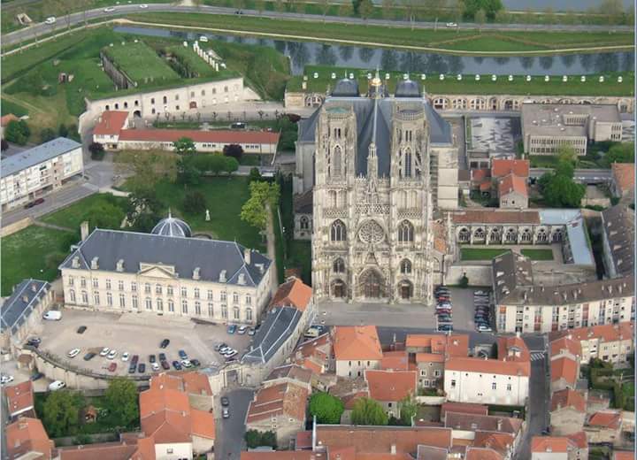 L’élévation sans triforium (type lorrain) est de plastique rémoise (long. tot. : 100 m, haut. : 30 m). Le vaste transept (17 m de large, 56 de long), s’orne d’immenses baies. La façade du XVe (haut. : 65,5 m) à grande rose et gâble géant s’inspire des modèles du XIIIe s.. Vitraux (XVIe et XIXe), autels renaissance et baroques, décor d’abside (XVIIe), sacristies, salles capitulaires, vaste cloître.