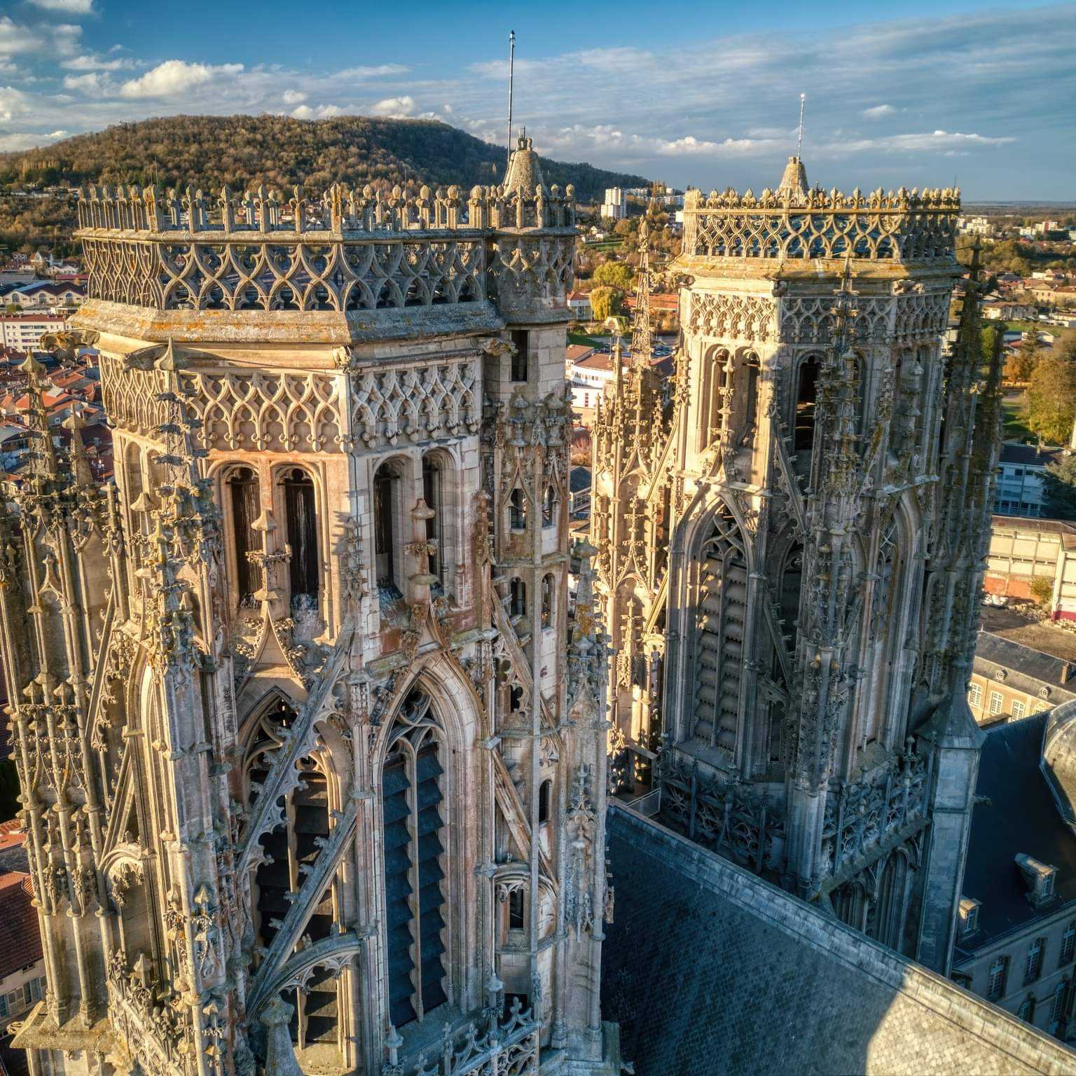 On exhausse l’abside et ses deux tours et monte les combles de 1500 à 1536. Une chapelle renaissance plafonnée à caissons est financée au n.-e. de la nef par l’évêque Hector d’Ailly en 1533, celle du s.-e., à coupole, en 1546-49 par le chantre Jean Forget.